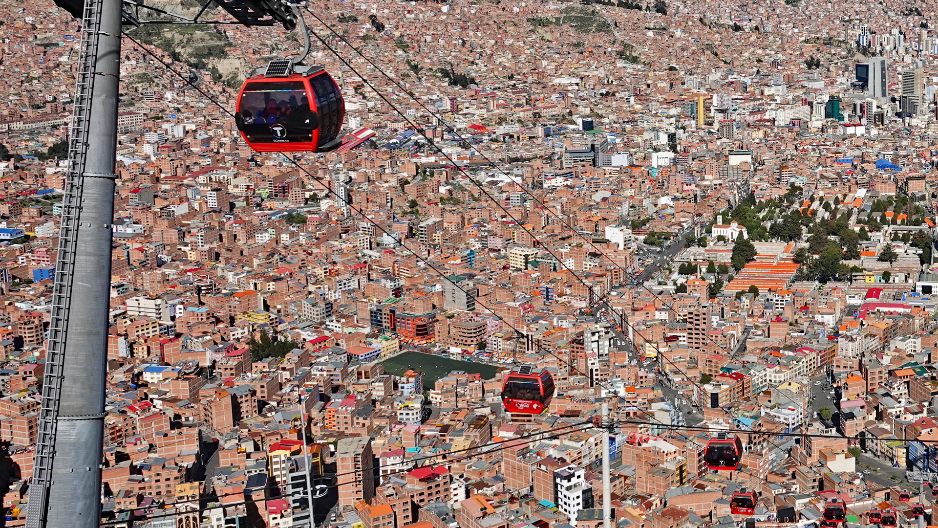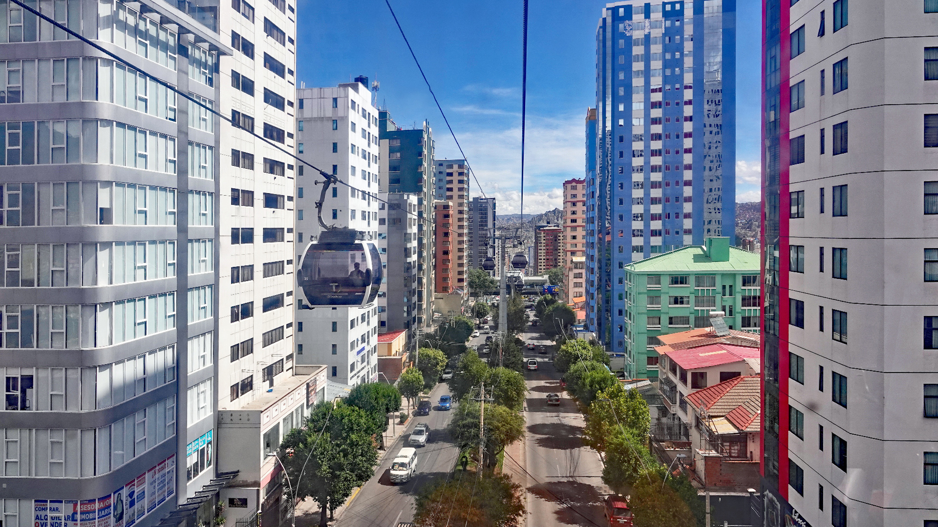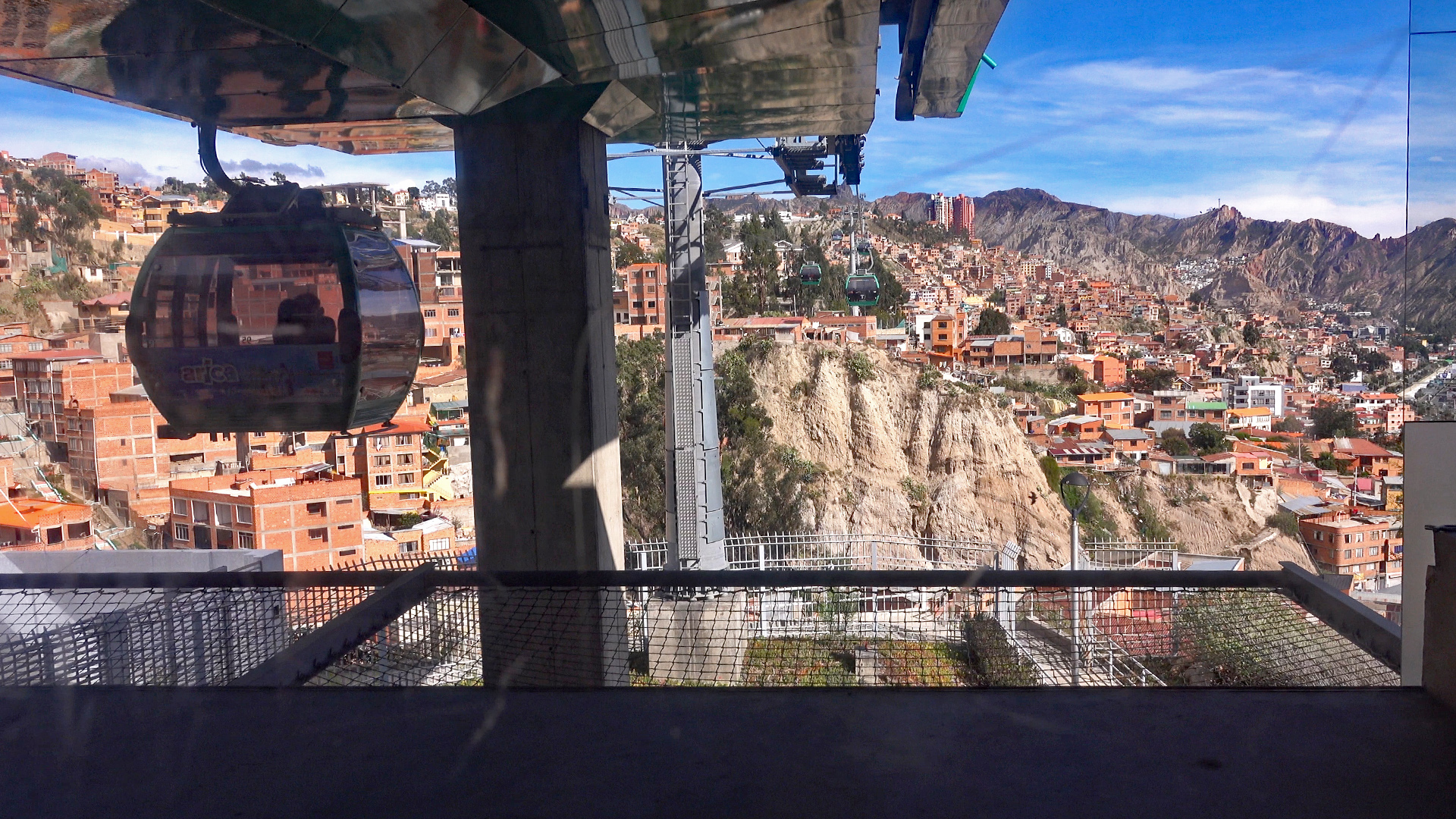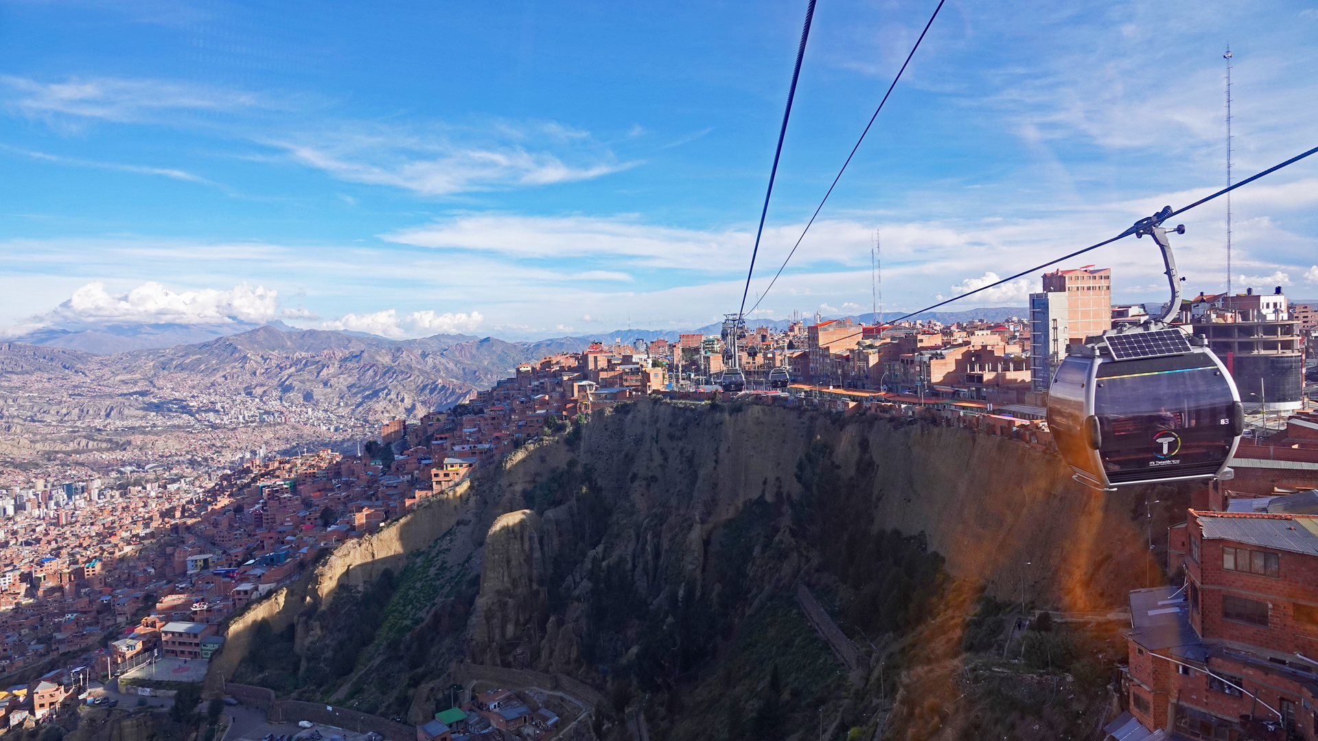 Die Kabinen kommen, eine nach der anderen. Wir steigen ein, die Türen schliessen, die Marktgeräusche verklingen, und mit einem spürbaren Ruck hebt sich die Gondel. Ein Zittern im Boden. Dann Schweben. Die Avenida fällt zurück. Augenblicke später erreichen wir die schroffe Abbruchkante am östlichen Rand der Hochebene. Da endet die obere Stadt, El Alto. Und beginnt eine andere, die unten, La Paz.