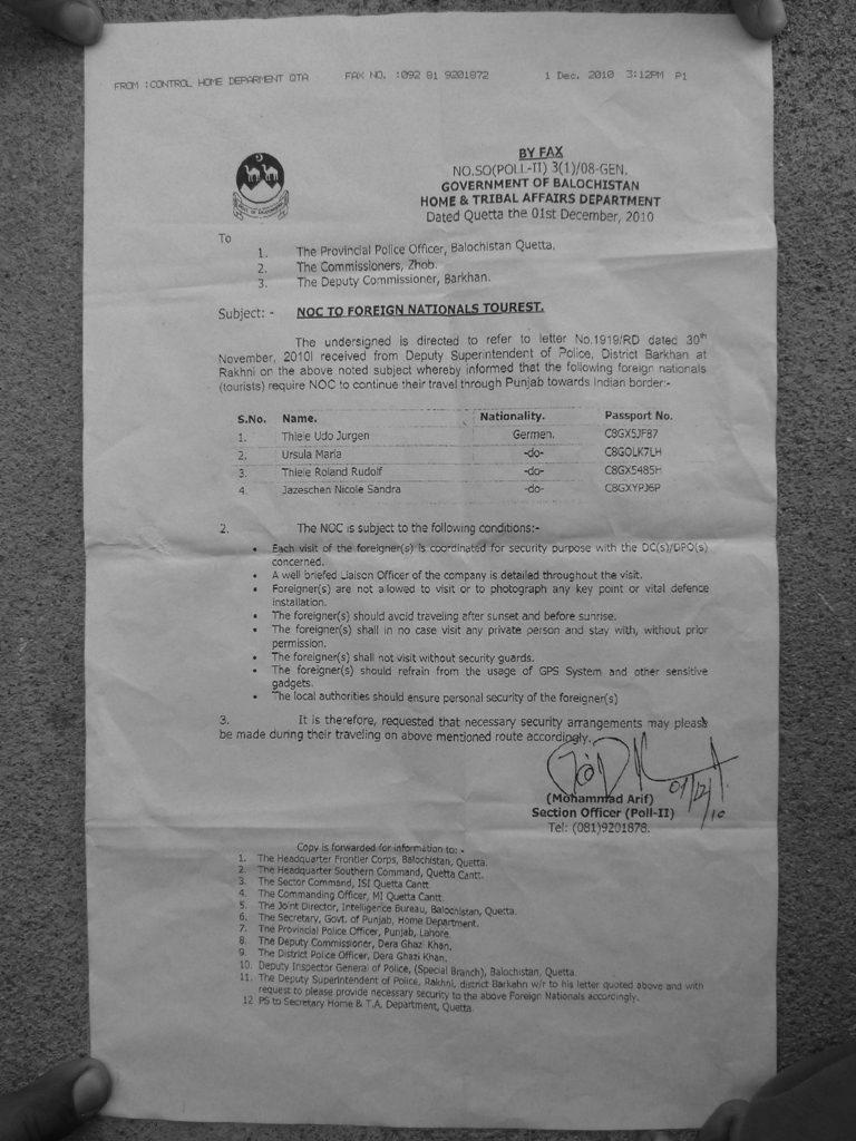 In unseren Reisepässen hatten wir “normale” Touristenvisa. Der zusätzliche Stempel Exempted from Police Registration genügte nicht, man benötigt eine zusätzliche Genehmigung zur Durchfahrung des Distrikts Dera Ghazi Khan, ein NOC vom Home & Tribal Affairs Department in Quetta. Wir haben Quetta nur durchfahren, wurden dort zwar von der Polizei begleitet, jedoch nicht auf die Notwendigkeit des NOC hingewiesen.